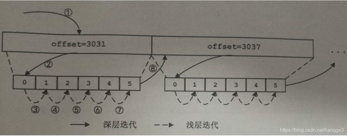 1. 首先创建浅层迭代器调用next方法,低啊用makeNext准备迭代项.在makeNext中会判断深层迭代器中是否完成,当前未开始深层迭代,则调用getNextEntryFromStream方法获取offset为3031的消息(①), 2. 检测3031消息压缩格式,创建深层迭代器,getNextEntryFromStream方法解压病放入logEntries队列。 3. 调用next方法,从logEntries中获取消息并返回② 4. ③到⑦重复这个过程,当深层迭代完成后,调用getNextEntryFromStream获取offset为3037的消息。转载地址:http://ejxx.baihongyu.com/